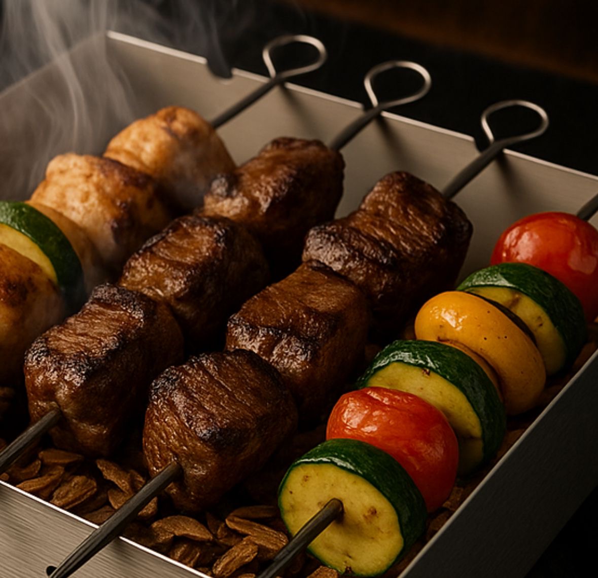 Zwei präzise gearbeitete Seiten mit passgenauen Vertiefungen fixieren Grillspieße bis 25 cm Länge sicher, damit nichts verrutscht und alles gleichmäßig gart.