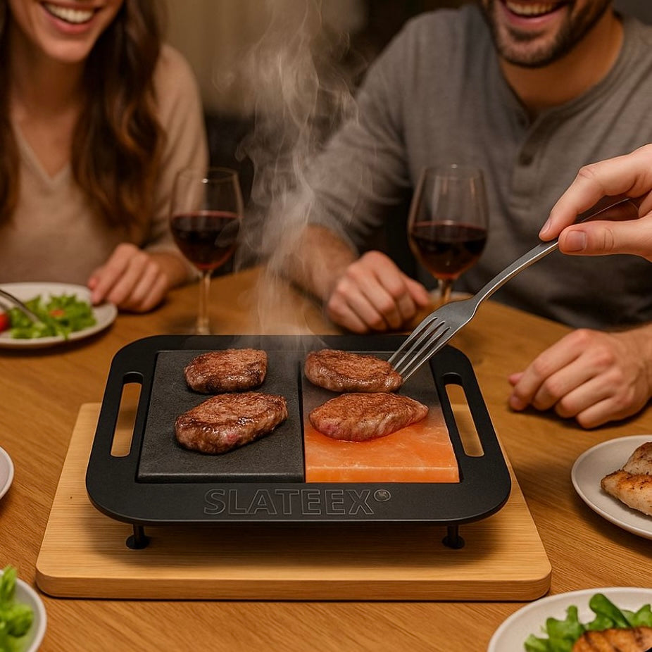 Dieses Naturstein-Duo ist ideal für alle, die beim BBQ auf Abwechslung, Natürlichkeit und ein besonderes Kocherlebnis setzen. Ob Rinderfilet auf Salz oder Garnelen auf Speckstein – mit dem Slateex Grillset holen Sie sich kulinarische Präzision und Vielfalt auf den Grill.