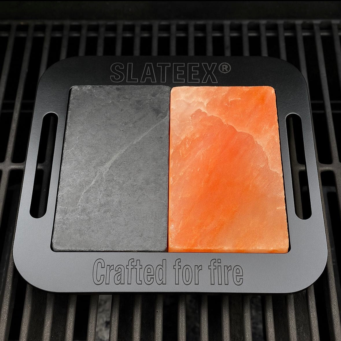 Ein Salzstein (20×10×2,5 cm) für fein gewürzten Geschmack direkt vom Stein, und ein Speckstein (20×10×3 cm) für gleichmäßige Hitze und intensives Röstaroma. Eingefasst in eine technisch durchdachte, formschöne Halterung – für vielseitigen Grillgenuss mit Stil.